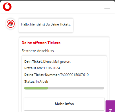 Das tut uns leid. Ruf unsere Hilfe bei Störung auf. Auf der Startseite kannst Du direkt Tickets verwalten anklicken. Halte dazu Deine Zugangsdaten für MeinVodafone bereit.