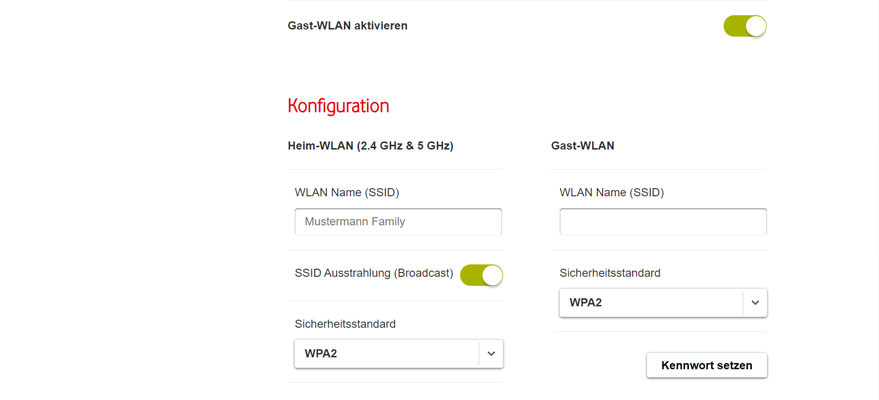 Gut zu wissen: Schaltest Du die Option ein, öffnet sich unter Konfiguration ein weiterer Bereich. Jetzt kannst Du Deinem Gast-WLAN einen eigenen WLAN-Namen (SSID) geben. Und auch das Kennwort für Dein Gast-WLAN setzen.