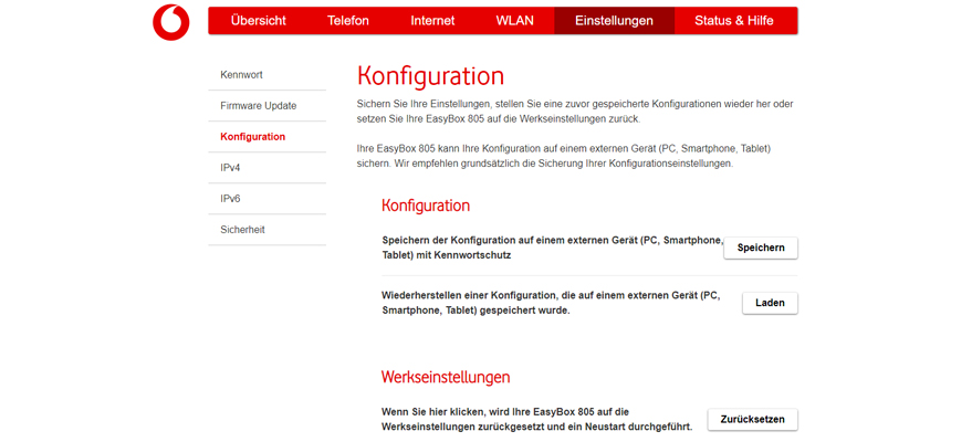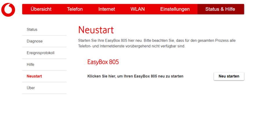 Klick auf Neu starten, um die EasyBox 805 neu zu starten.