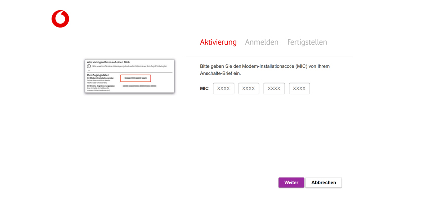 Gib den Modem-Installationscode von Deinem Willkommensbrief für Deinen DSL-Anschluss ein.