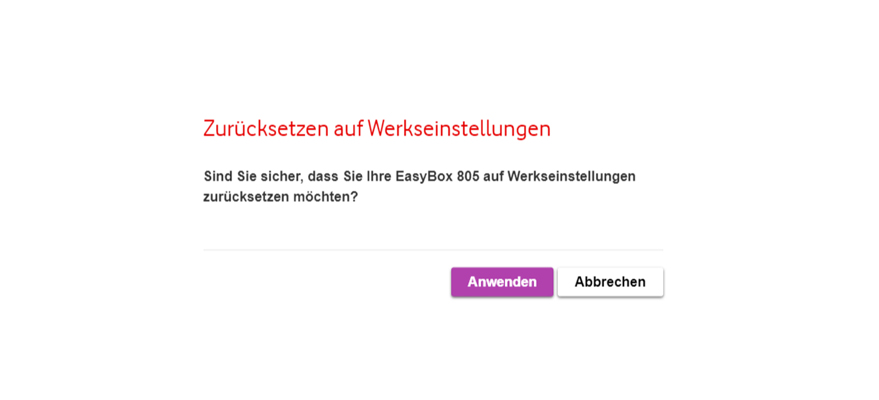 Wähl Anwenden, wenn Du Dir sicher bist. Denn danach wird Deine EasyBox auf die Werkseinstellungen zurückgesetzt und ein Neustart durchgeführt.