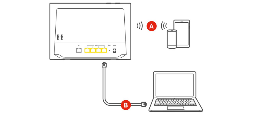 Verbinde Deinen Computer mit einem der gelben LAN-Anschlüsse Deiner EasyBox. Nutz dafür das mitgelieferte LAN-Kabel.