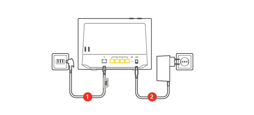 Verbinde das mitgelieferte Netzteil (2) der EasyBox mit dem Netzanschluss (Power) und einer Steckdose.