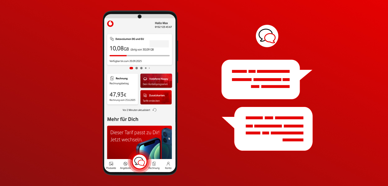 Klick in der MeinVodafone-App unten im Bildschirm auf den Button mit den Sprechblasen. Dann kannst Du sofort chatten.
