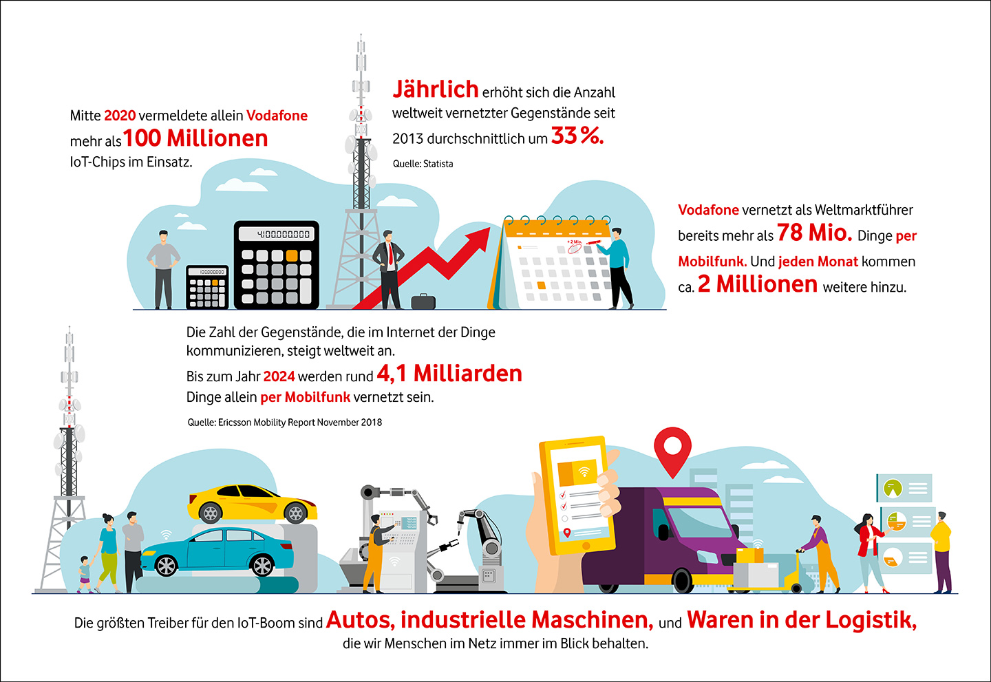 Der Mobility Report von Ericsson aus dem Jahr 2018 zeigt, dass bis zum Jahr 2024 rund 4,1 Milliarden Dinge allein per Mobilfunk vernetzt sein werden.3 Jährlich erhöht sich die Anzahl weltweit vernetzter Gegenstände seit 2013 durchschnittlich um 33 Prozent. Vodafone ist Weltmarktführer und hat 2020 schon mehr als 100 Millionen IoT-Chips im Einsatz.2 Das IoT boomt, vor allem in den Bereichen Unterhaltungselektronik, industrielle Fertigung, Waren in der Logistik, Automotive und Biowissenschaften.