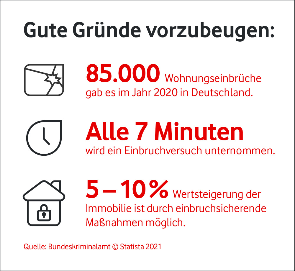 Wollen Vermieter den Sicherheitsstandard in ihrem Mehrfamilienhaus erhöhen, ist eine gründliche Analyse des Status Quo inklusive Sicherheitstests sinnvoll. Und eine Beratung durch Sicherheitsexperten oder die Beratungsstellen der Kriminalpolizei. Grundlage für smarte Sicherheitstechnik ist in jedem Fall eine zeitgemäße technische Infrastruktur des Hauses: eine stabile, schnelle Internet-Verbindung. Noch effizienter und sicherer ist es, wenn die Sicherheitssysteme ganzheitlich in die digitale Gebäudesteuerung eingebunden und über eine offene IoT-Plattform wie Gebäudekonnektivität 4.0 von Vodafone vernetzt sind. Arbeiten verschiedene Systeme und Geräte miteinander statt nebeneinander, lassen sich Synergien nutzen und tiefere Einblicke in den aktuellen und generellen Gebäudezustand gewinnen. Und das sorgt auf allen Ebenen für mehr Sicherheit und Schutz im Mehrfamilienhaus.