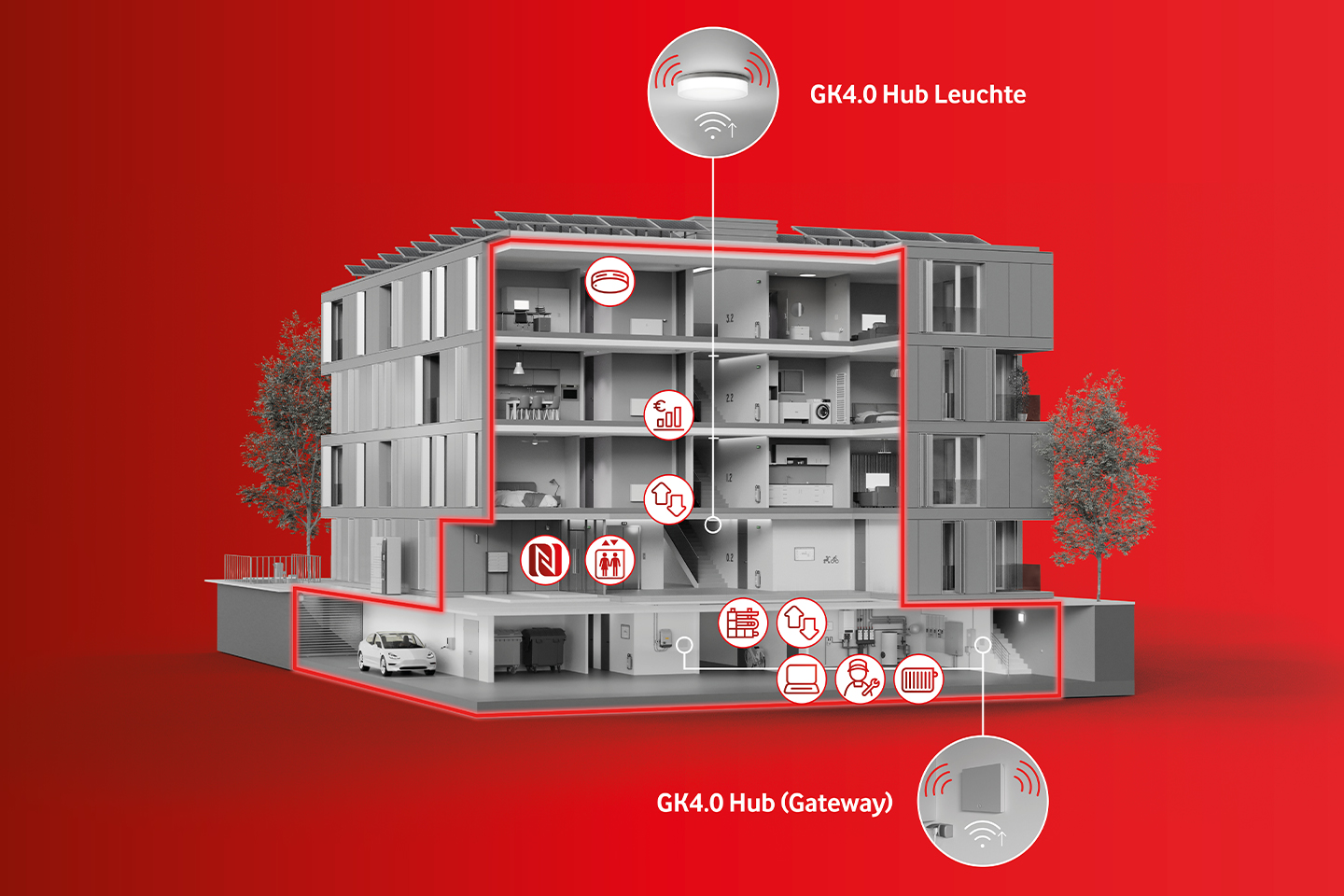 Das Vodafone IoT-Gateway – das GK4.0-Hub – ist der zentrale Datenknotenpunkt im Heizungskeller. Mit einer sicheren Datenverbindung sendet es in Echtzeit alle Messdaten in die Vodafone IW-Cloud. Alle gängigen IoT-Protokolle (z.B. ZigBee, M-Bus, Bluetooth usw.) können verarbeitet werden. Deshalb ist eine Erweiterung um viele zusätzliche Anwendungsfälle im Objekt jederzeit möglich.