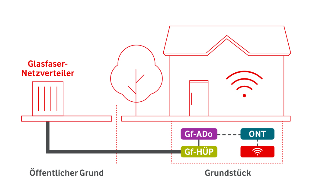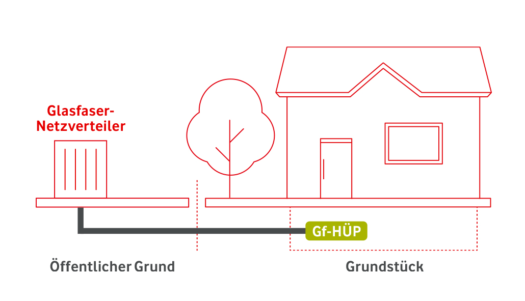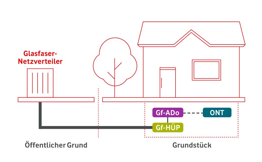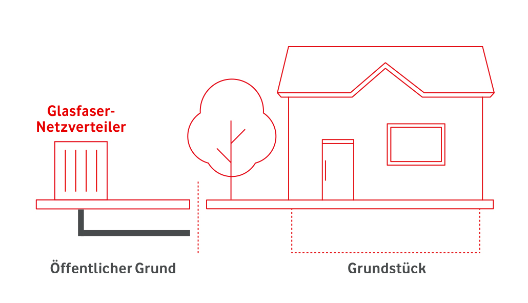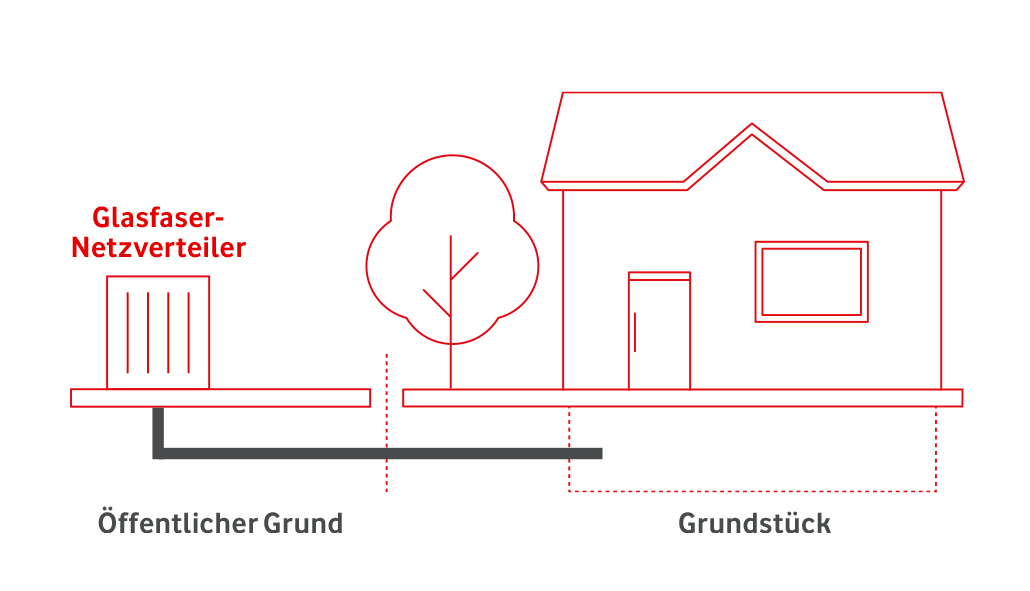 Die Glasfaser-Leitung wird vom nächstgelegenen Glasfaser-Netzverteiler auf öffentlichem Grund bis in die Straße und von da aus so nah wie möglich an Ihr Grundstück herangeführt.