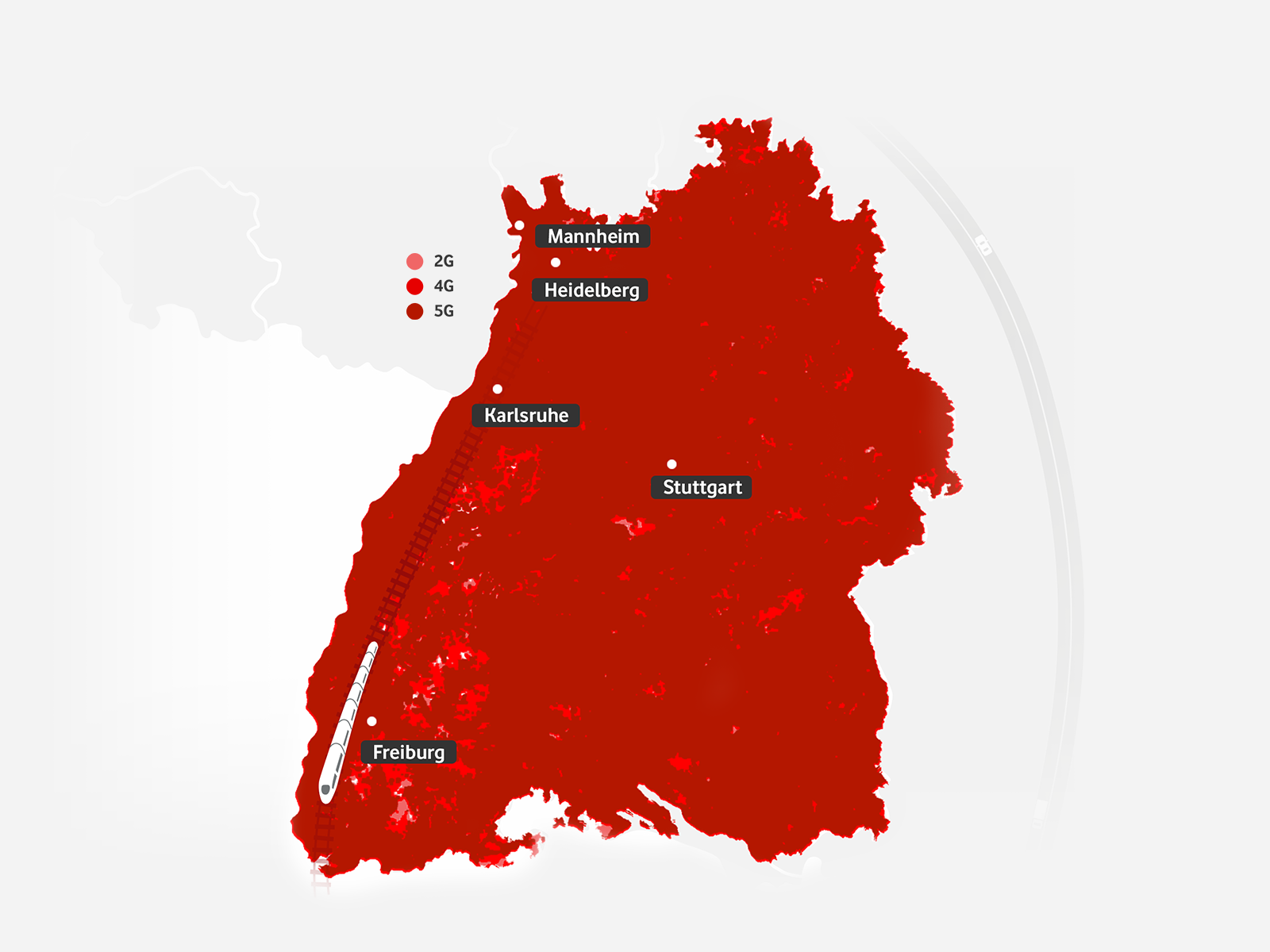 98,6 % aller Haushalte in Baden-Württemberg sind mit dem schnellen Breitband-Internet via LTE oder 5G versorgt. 98,8 % ihrer Zeit bewegen sich Vodafone-Kunden im schnellen LTE- oder 5G-Netz.