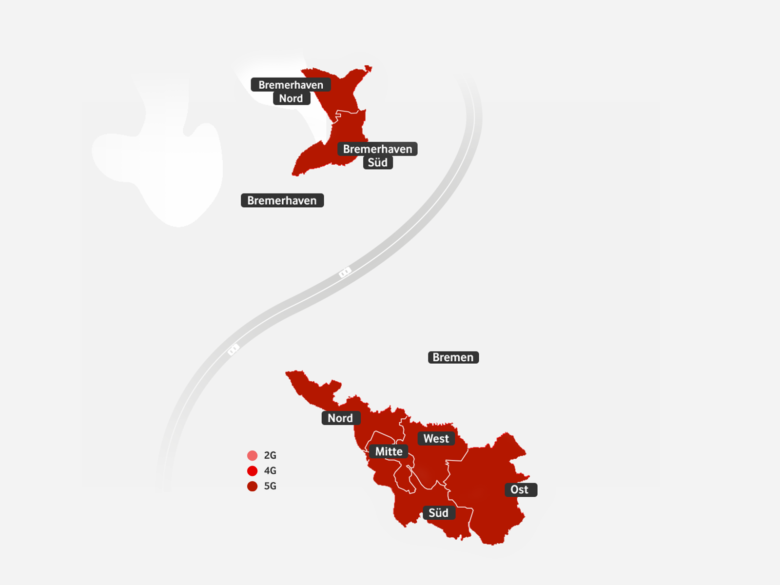 99,9 % aller Haushalte in Bremen sind mit dem schnellen Breitband-Internet via LTE oder 5G versorgt. 99,8 % ihrer Zeit bewegen sich Vodafone-Kunden im schnellen LTE- oder 5G-Netz.