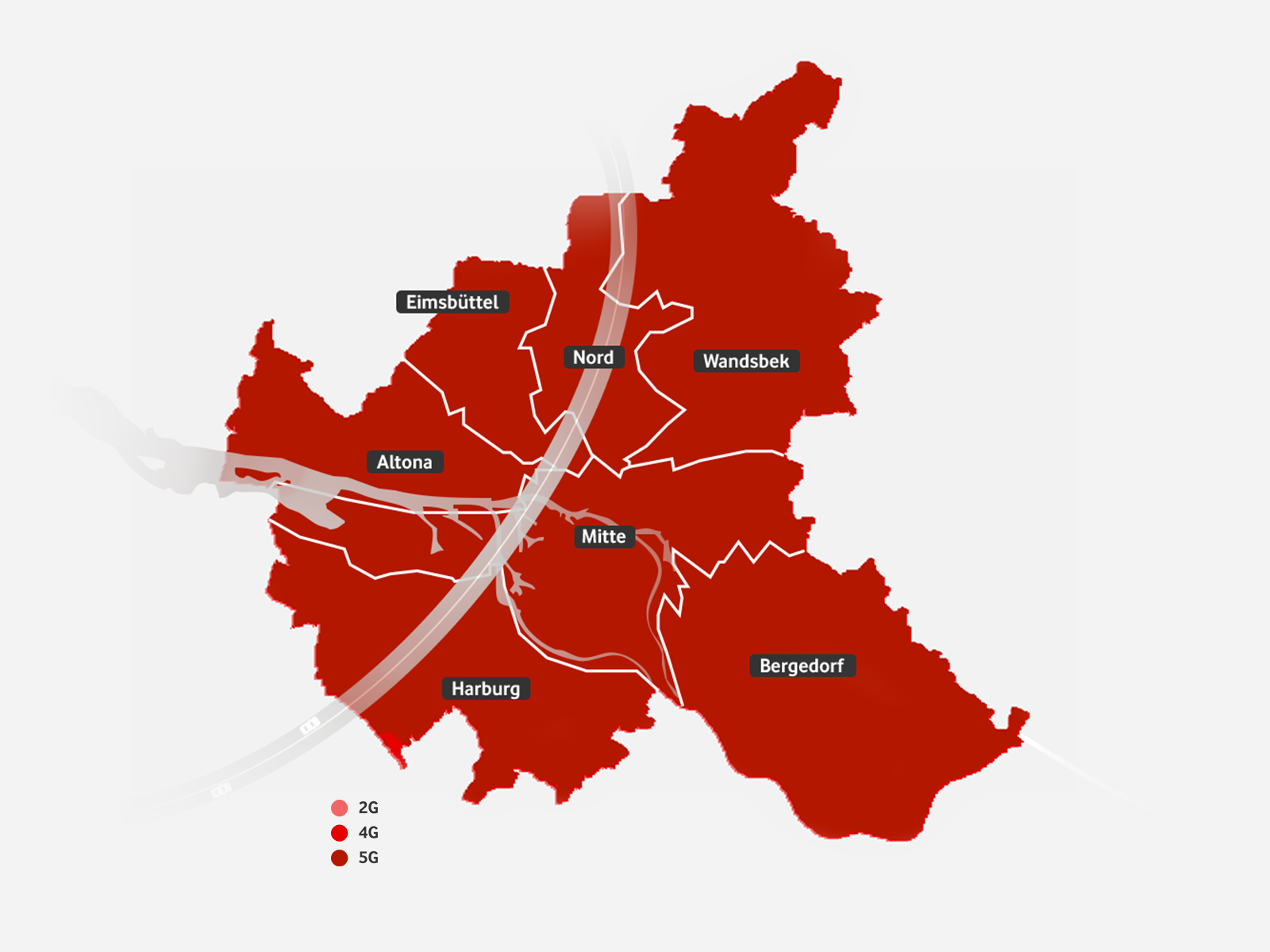 99,9 % aller Haushalte in Hamburg sind mit dem schnellen Breitband-Internet via LTE oder 5G versorgt. 99,6 % ihrer Zeit bewegen sich Vodafone-Kunden im schnellen LTE- oder 5G-Netz.
