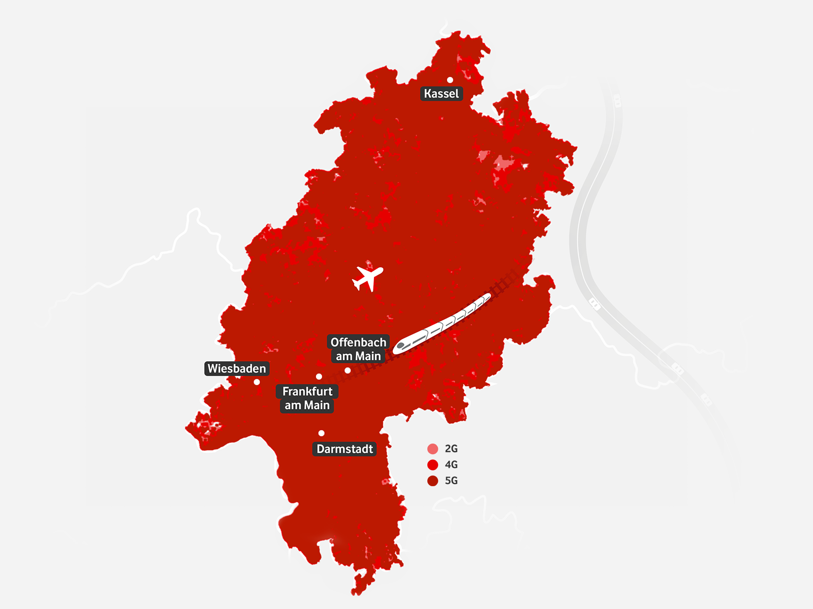 98,4 % aller Haushalte in Hessen sind mit dem schnellen Breitband-Internet via LTE oder 5G versorgt. 99,2 % ihrer Zeit bewegen sich Vodafone-Kunden im schnellen LTE- oder 5G-Netz.
