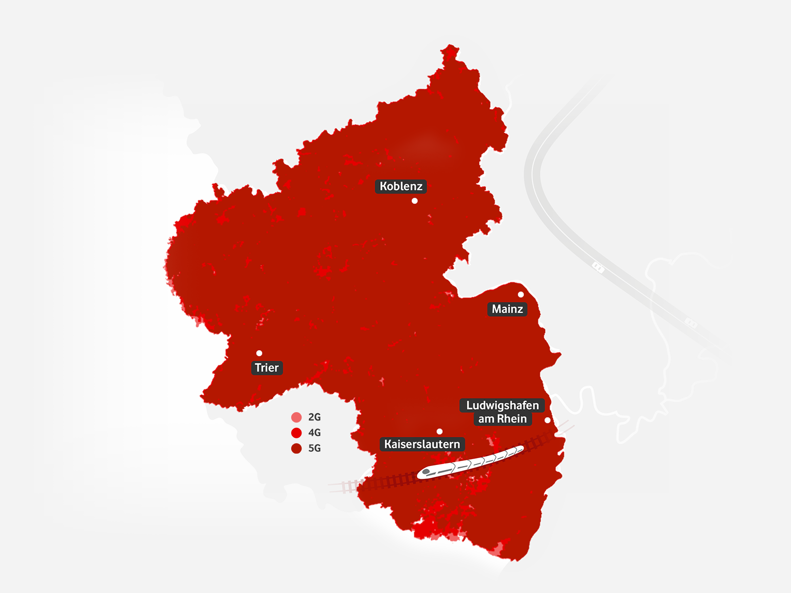 98,2 % aller Haushalte in Rheinland-Pfalz sind mit dem schnellen Breitband-Internet via LTE oder 5G versorgt. 98,8 % ihrer Zeit bewegen sich Vodafone-Kunden im schnellen LTE- oder 5G-Netz.
