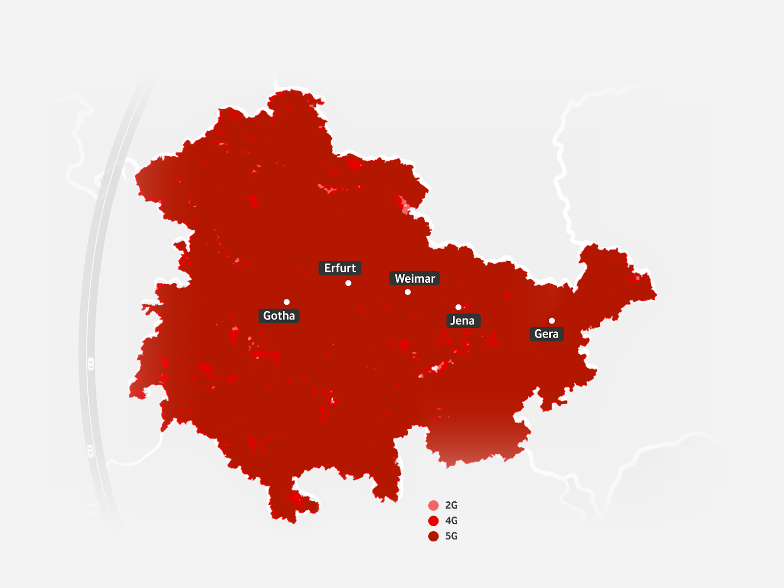 98,6 % aller Haushalte in Thüringen sind mit dem schnellen Breitband-Internet via LTE oder 5G versorgt. 99,5 % ihrer Zeit bewegen sich Vodafone-Kunden im schnellen LTE- oder 5G-Netz.