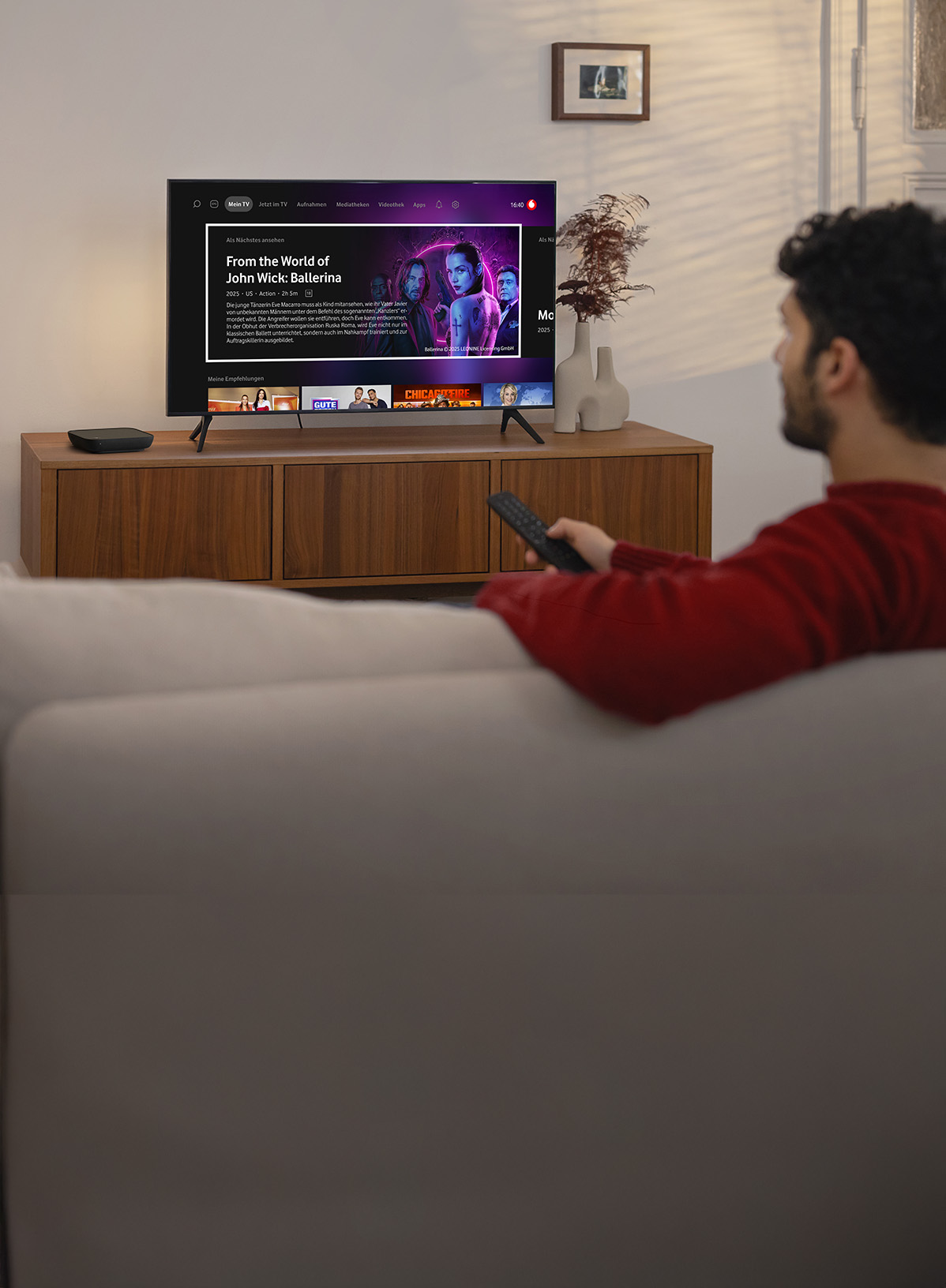 GigaTV ist unser TV-Tarif. Du kannst mit GigaTV übers Internet fernsehen oder über Deinen Kabelanschluss. Je nachdem, was besser zu Deinem Anschluss passt. GigaTV ist Deine Plattform für klassisches Fernsehen. Du bekommst aber auch Zugriff auf Mediatheken und Video-on-Demand. Und Du kannst Dir Entertainment-Apps runterladen und über Deine GigaTV-Box streamen. Auf Wunsch buchst Du Optionen wie Vodafone Premium oder Netflix dazu.