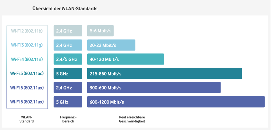 Mit WiFi 6 - ab GigaZuhause 250 Kabel Bis 4.800 Mbit/s brutto in 5 GHz und bis 1.200 Mbit/s brutto in 2,4 GHz – die real erreichbare Geschwindigkeit im WLAN ist u.a. abhängig von Deinem Gerät. 4 x 4 Wi-Fi 6 (ax) mit Multi-User-MIMO Kompatibel zu älteren WLAN-Standards |